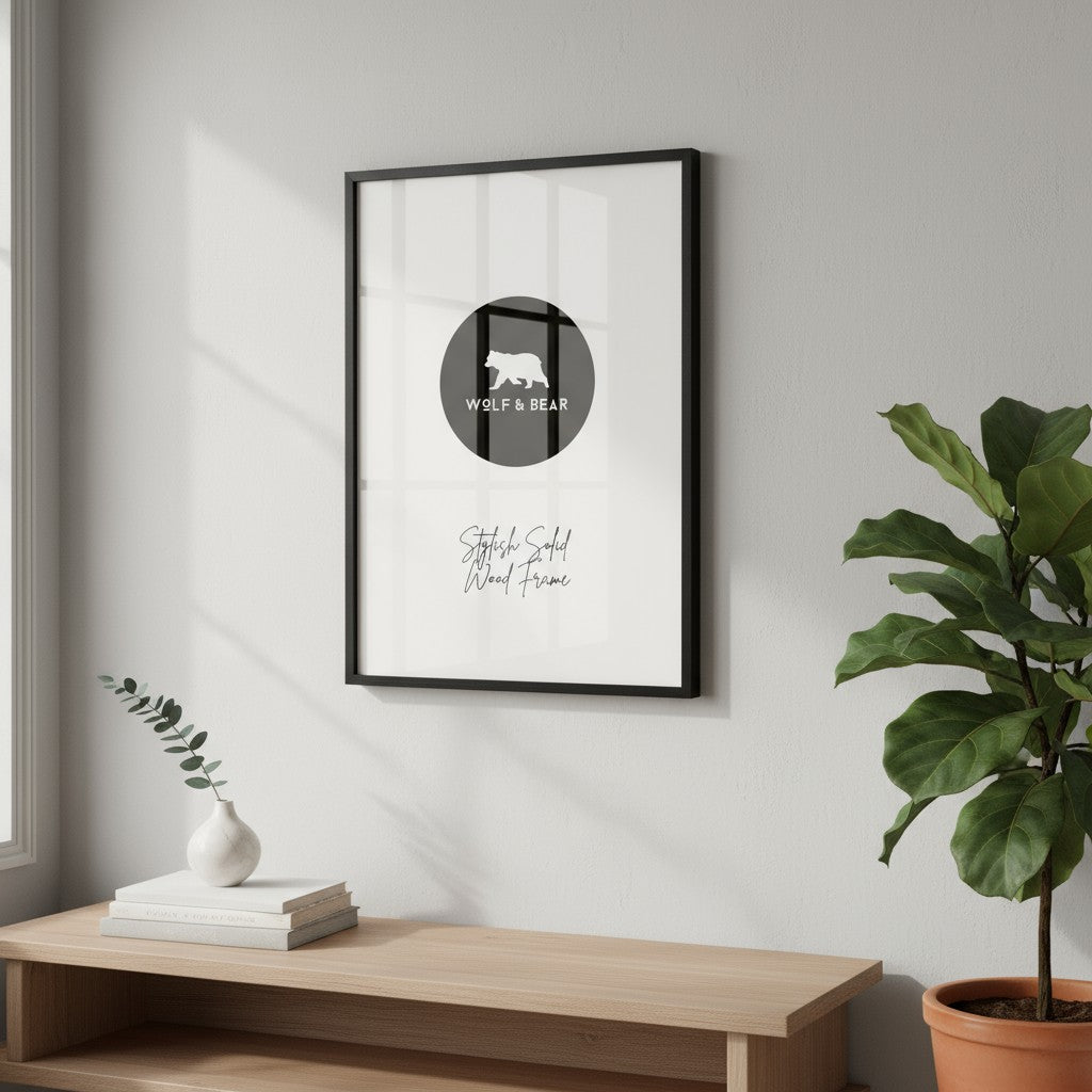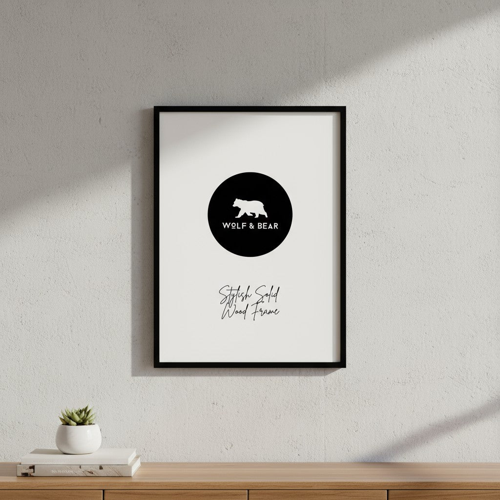 At Wolf & Bear, we offer frames in sizes ranging from 30×40 cm to 50×70 cm. As a small business,  our standard collection features only sleek matte black frames. However we now offer other colours which are hand crafted in the UK.